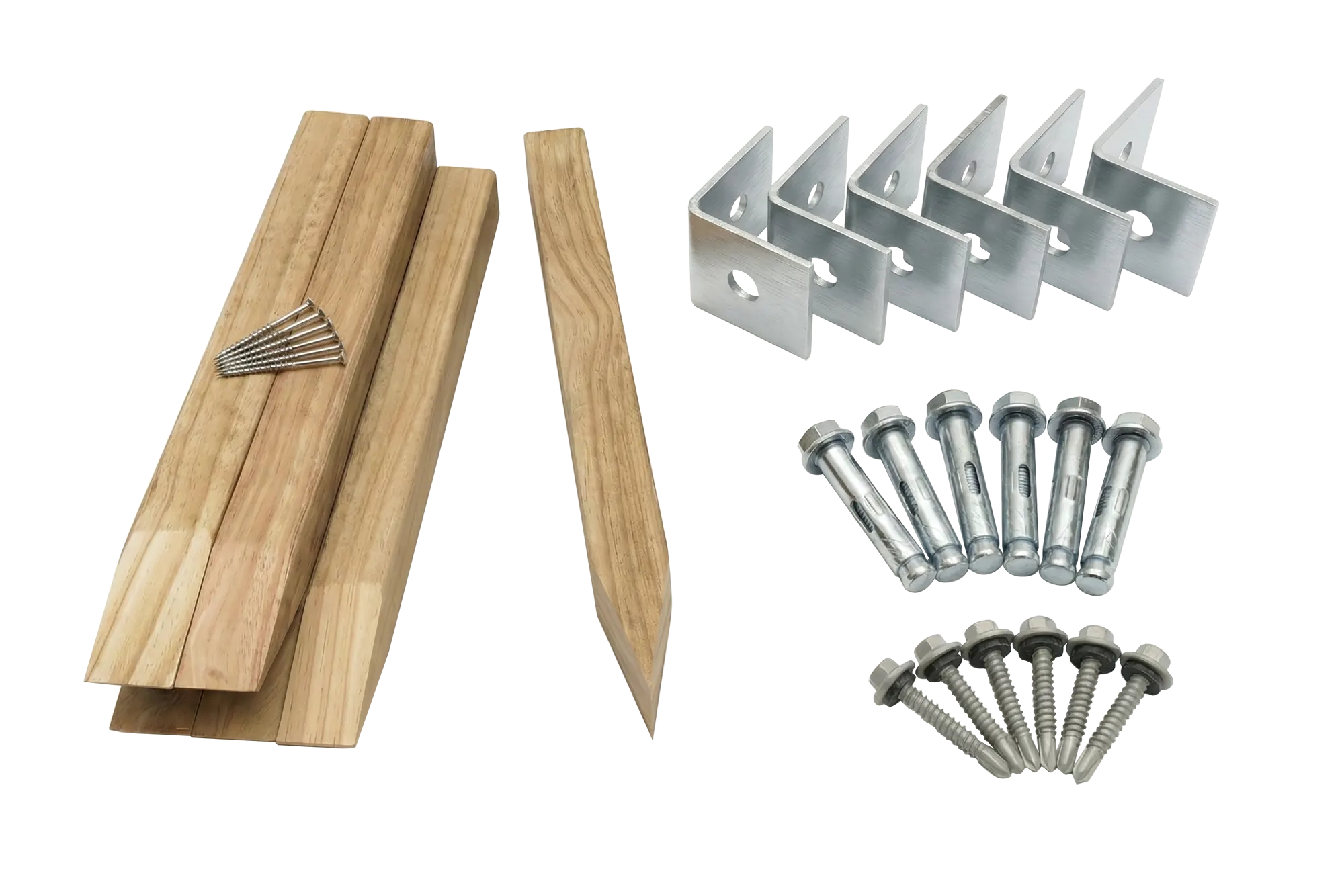Peg Down Kit: Includes H5 treated timber pegs and stainless steel screws for anchoring in sand or dirt substrates.