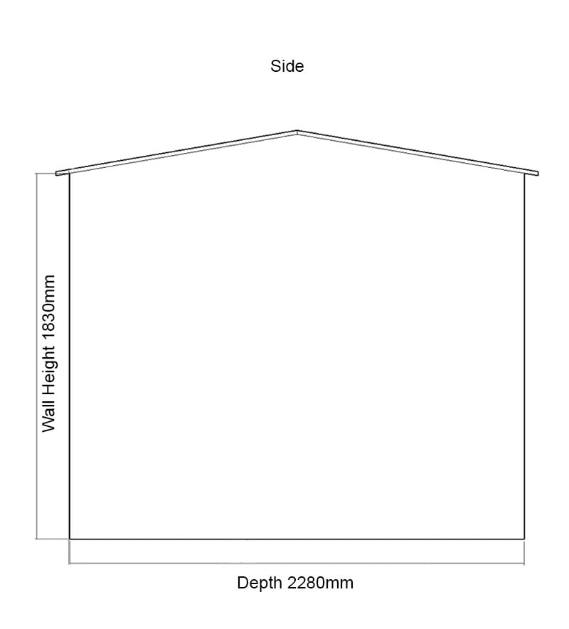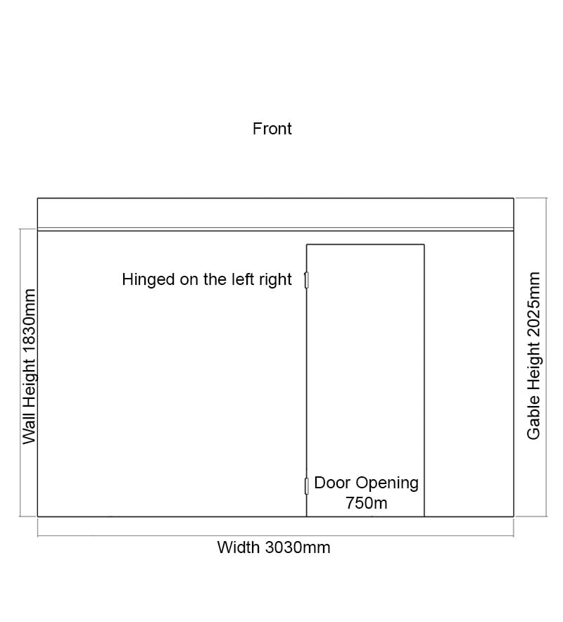 Gable Roof – Width: 3030mm, Depth: 2280mm Wall Height: 1830mm, Gable Height: 2025mm Area: 6.91m2 Door Opening: 750mm