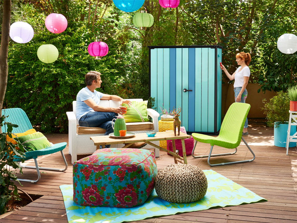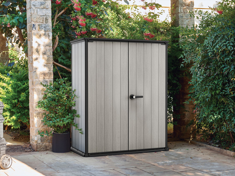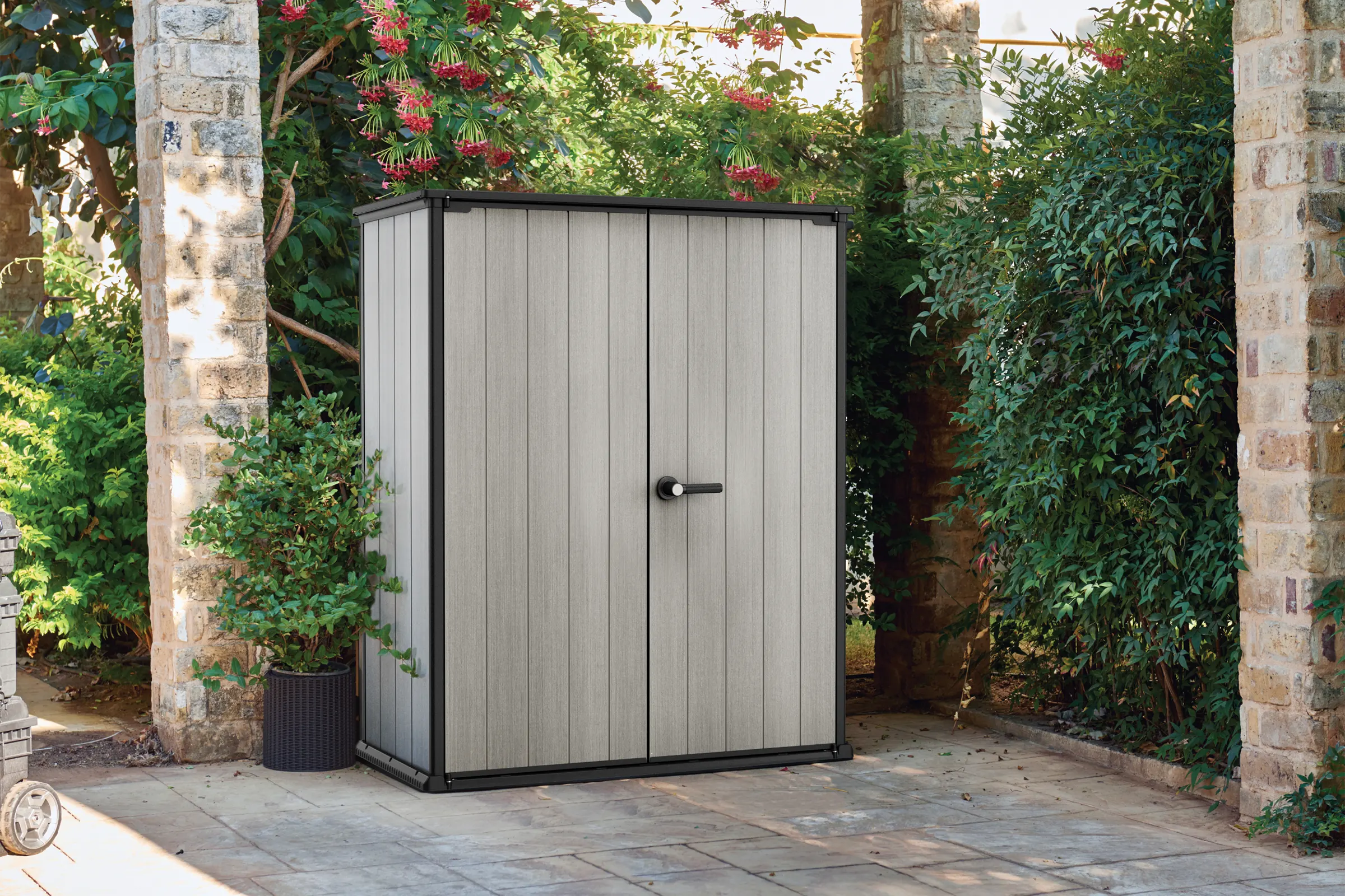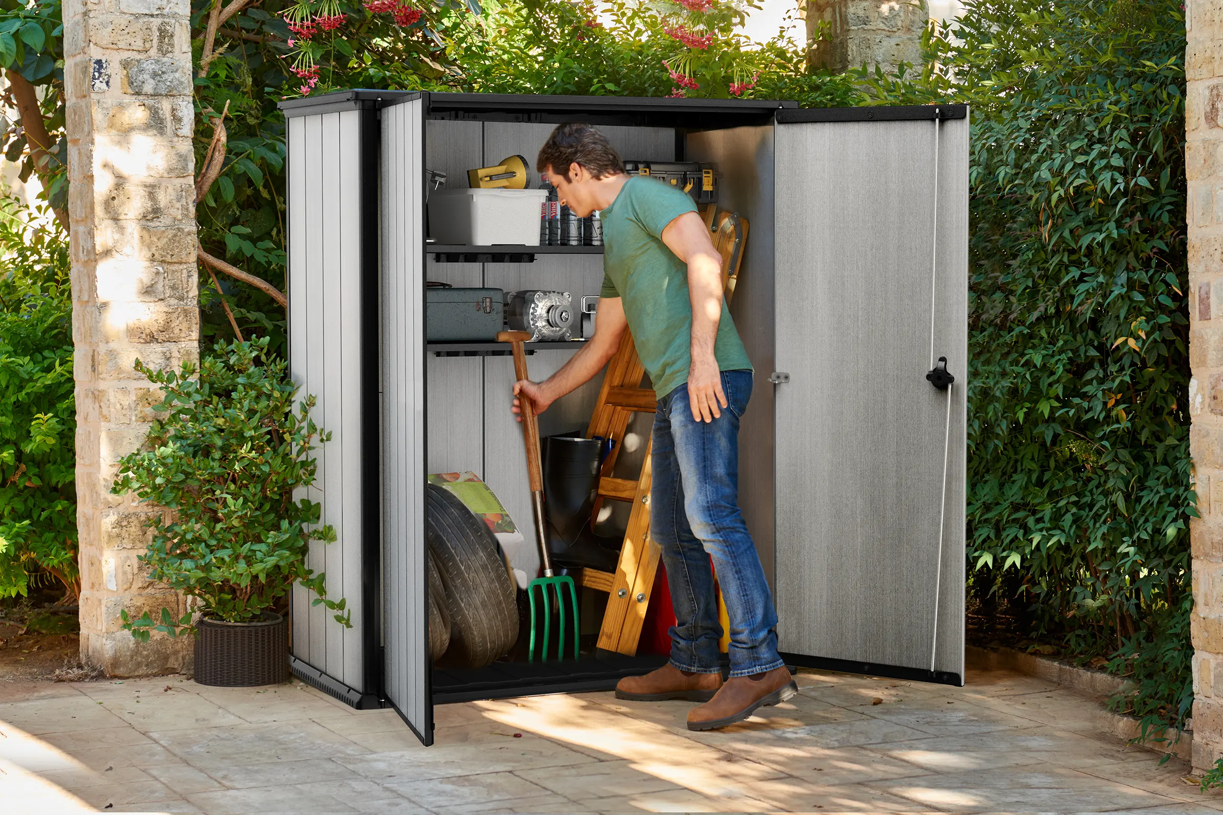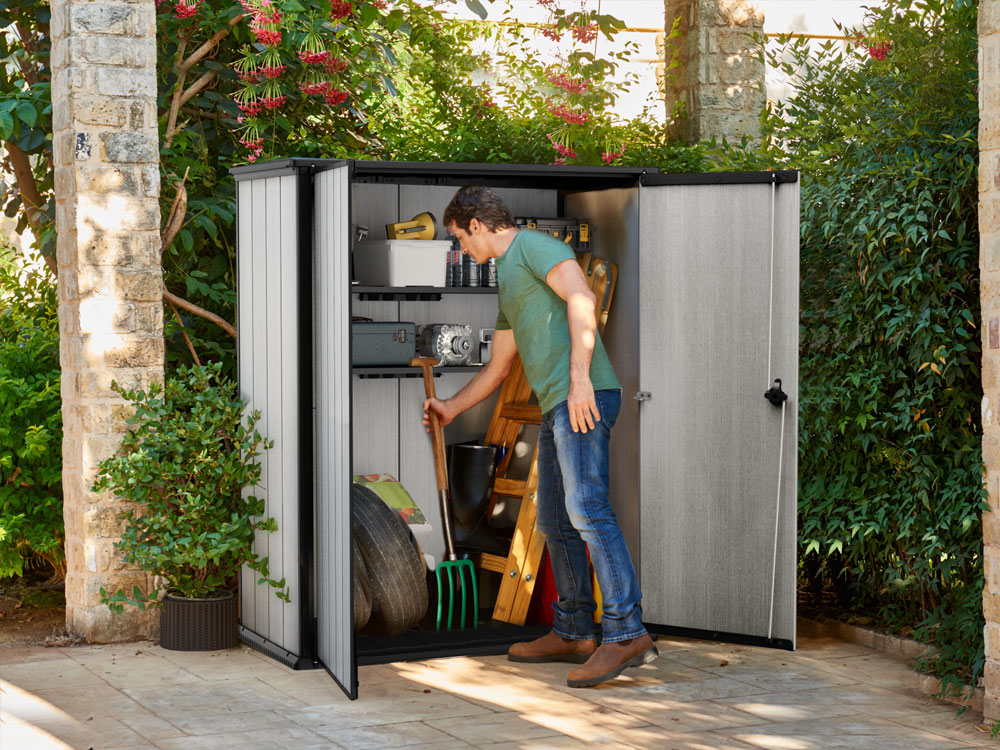 This durable garden shed offers wide double doors, a sloped threshold for easy access, and a heavy-duty floor to keep items clean and dry. Two shelves are included to maximise space. Made from weather-resistant DUOTECH™ walls that can be painted to suit your garden.