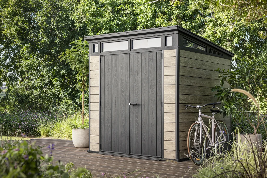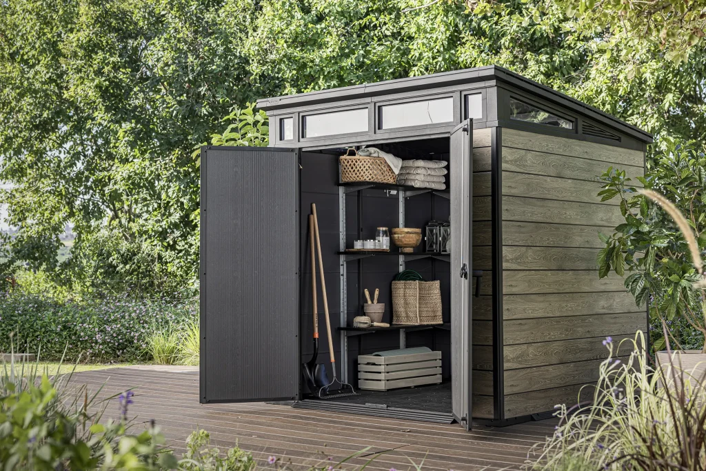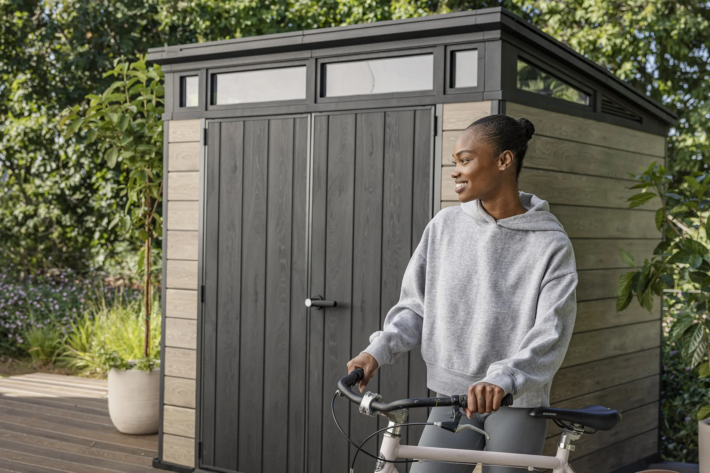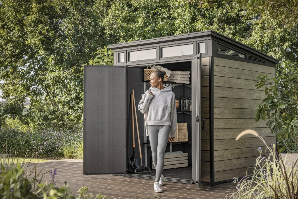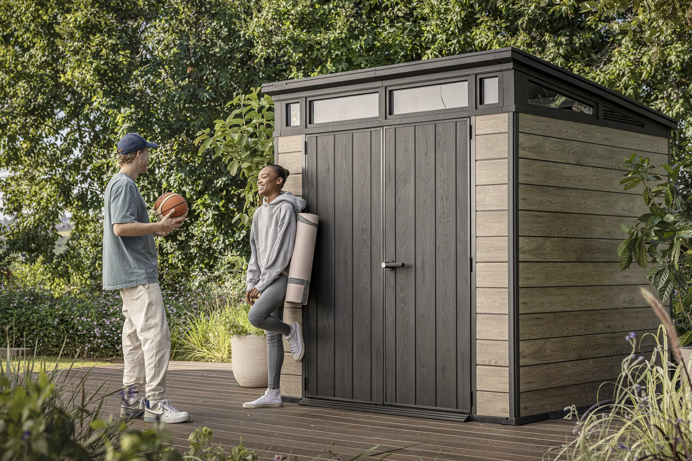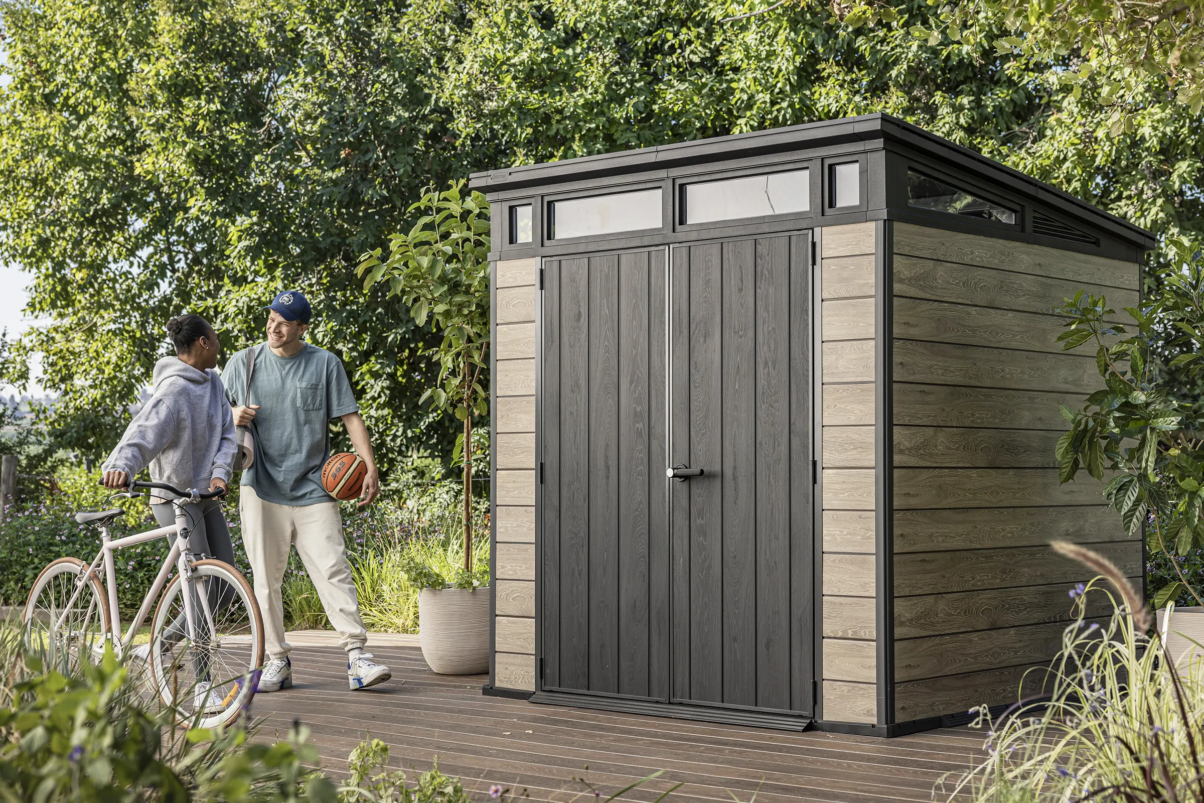 Brighten your outdoor space with the Ashwood 7×7, a premium storage solution from the Signature Collection that features a light, modern aesthetic and industrial-grade strength. This sophisticated shed is built with innovative composite walls that capture the natural beauty of weathered timber, providing a stylish and maintenance-free sanctuary for your garden tools and equipment.