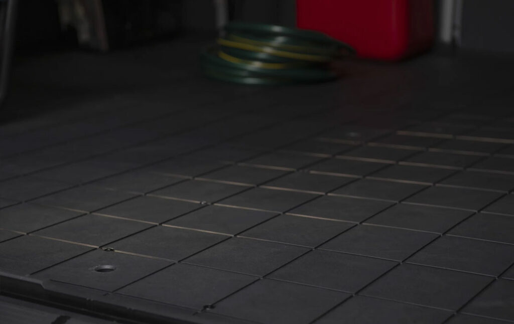 – Heavy-duty floor panel safeguards contents from mud and rainwater.