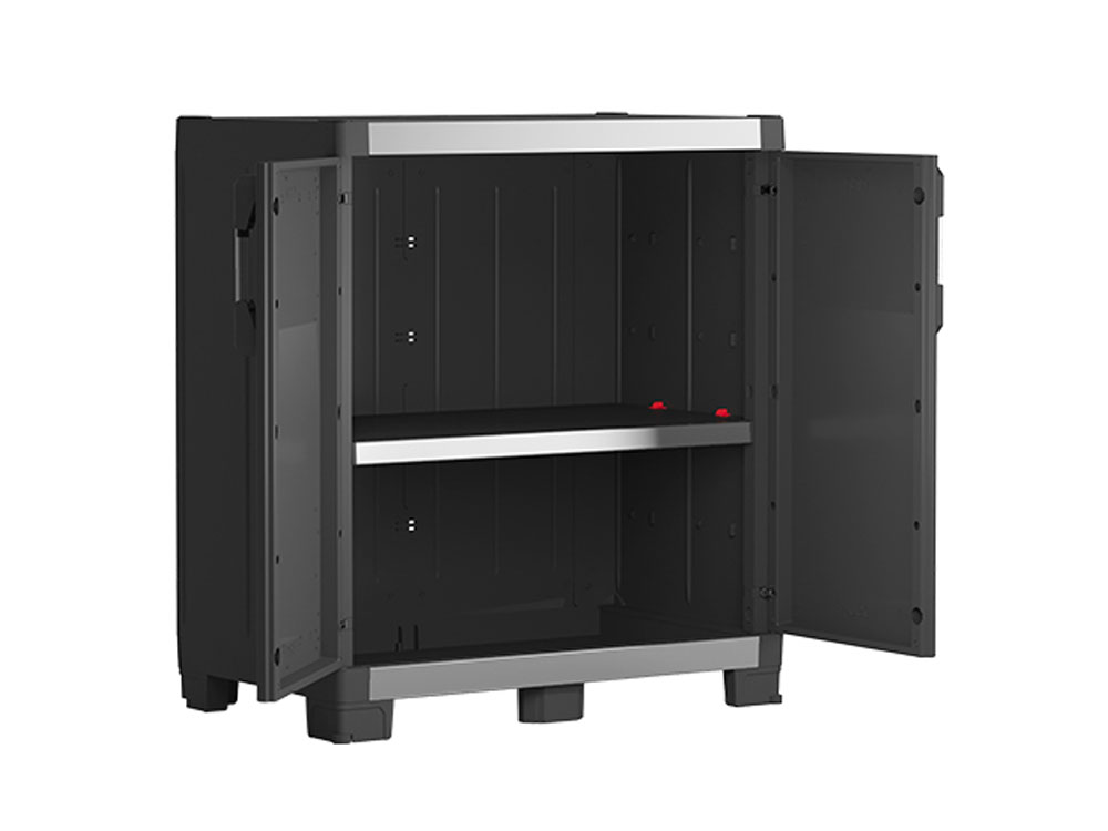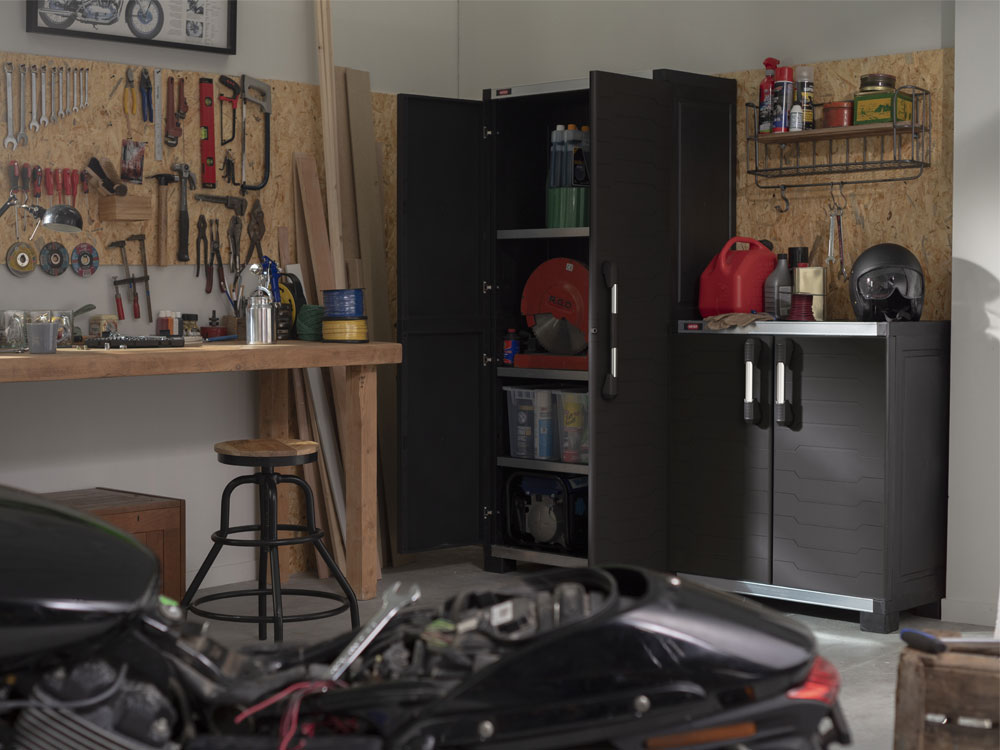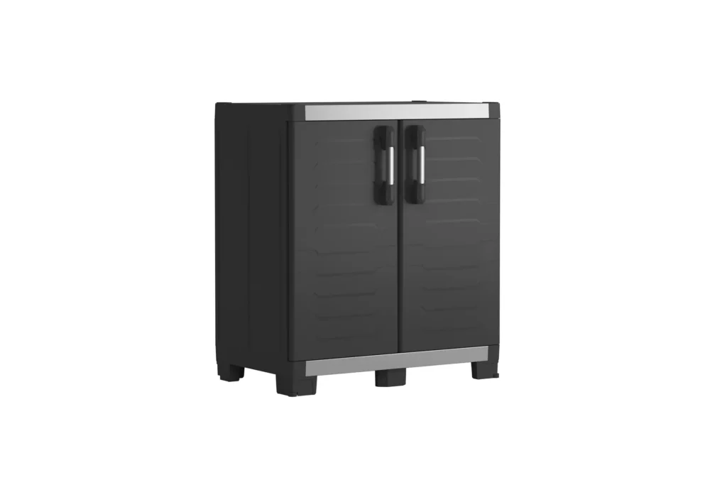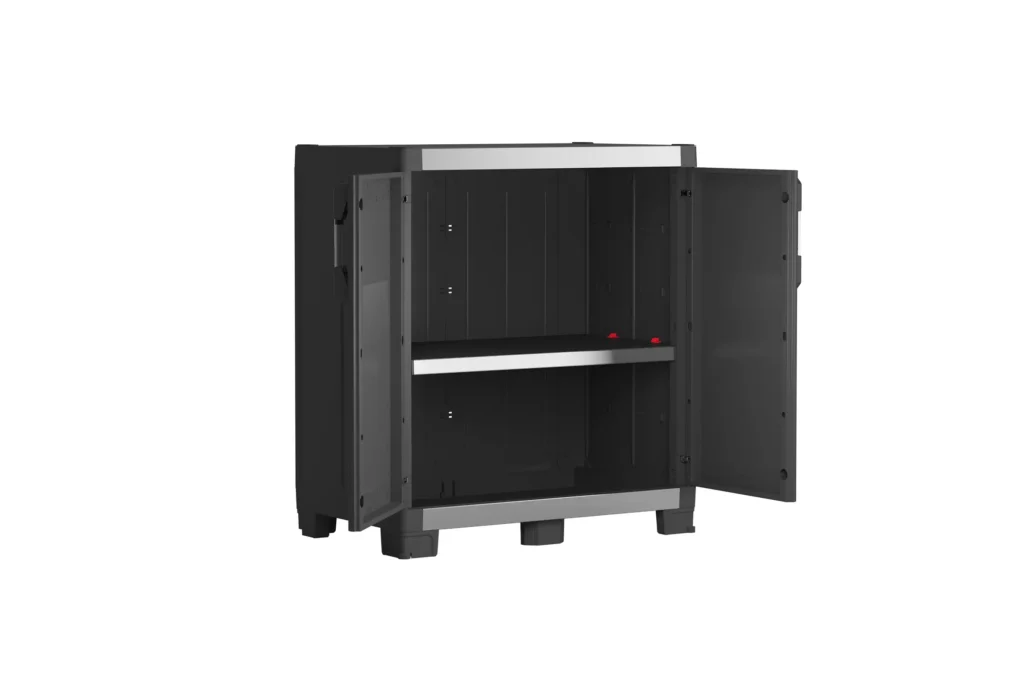 The XL Garage Base Cabinet is built for tough storage needs with a clean, modern look. It features a reinforced base, metal handles and hinges, and one adjustable shelf that holds up to 45kg. Lockable doors add extra security for your gear.