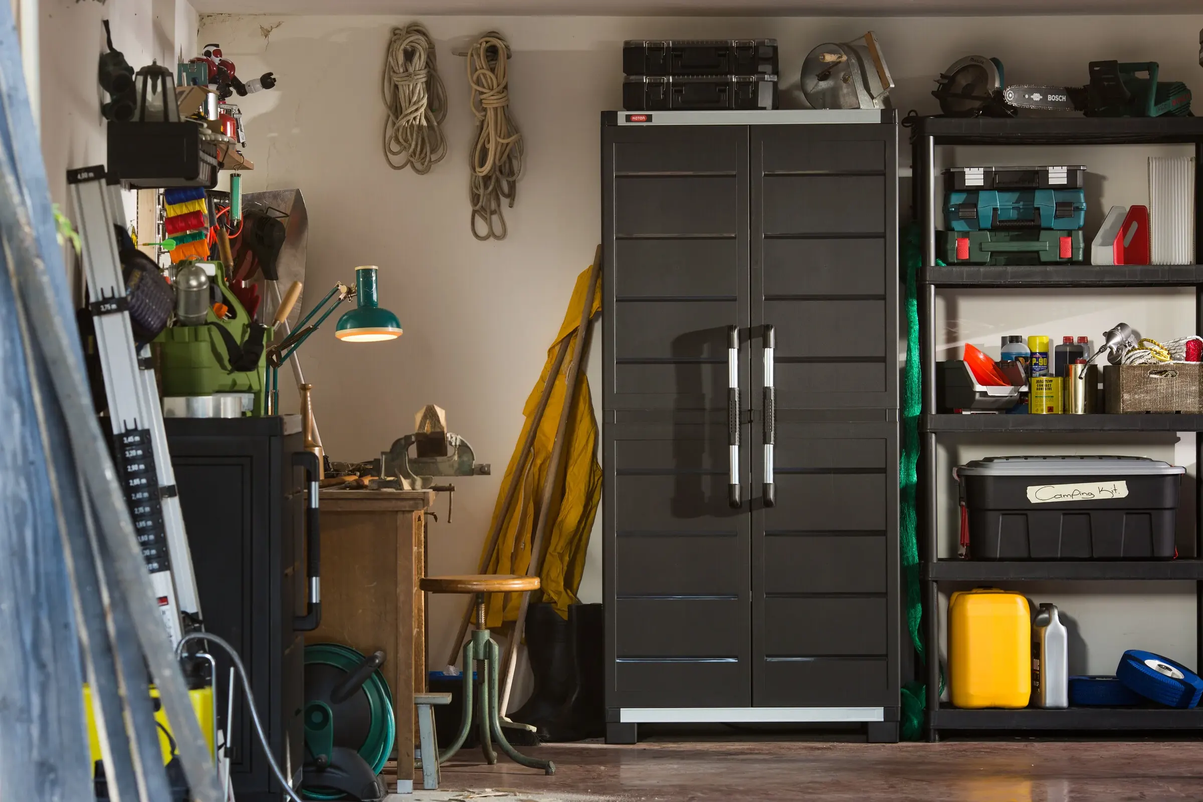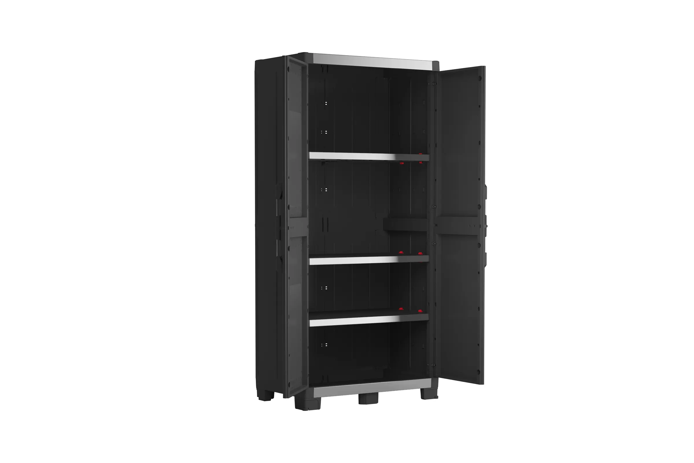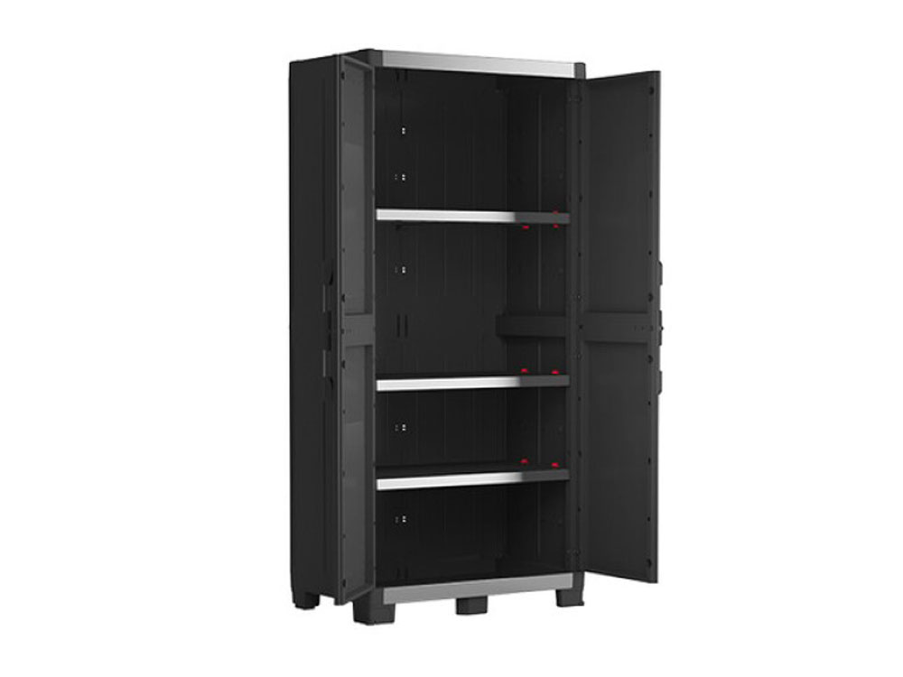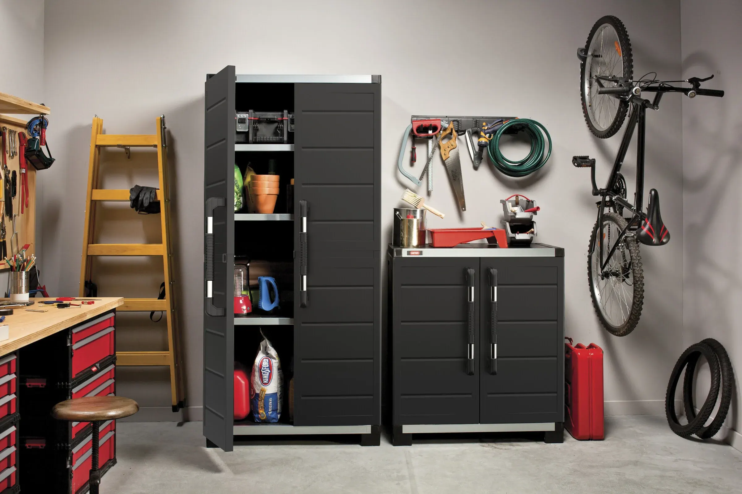 The XL Garage Tall Cabinet is a tough, secure storage solution with a sleek design. It includes three adjustable shelves, each holding up to 45kg, along with reinforced bottoms, metal handles and hinges, and lockable doors for added security.
