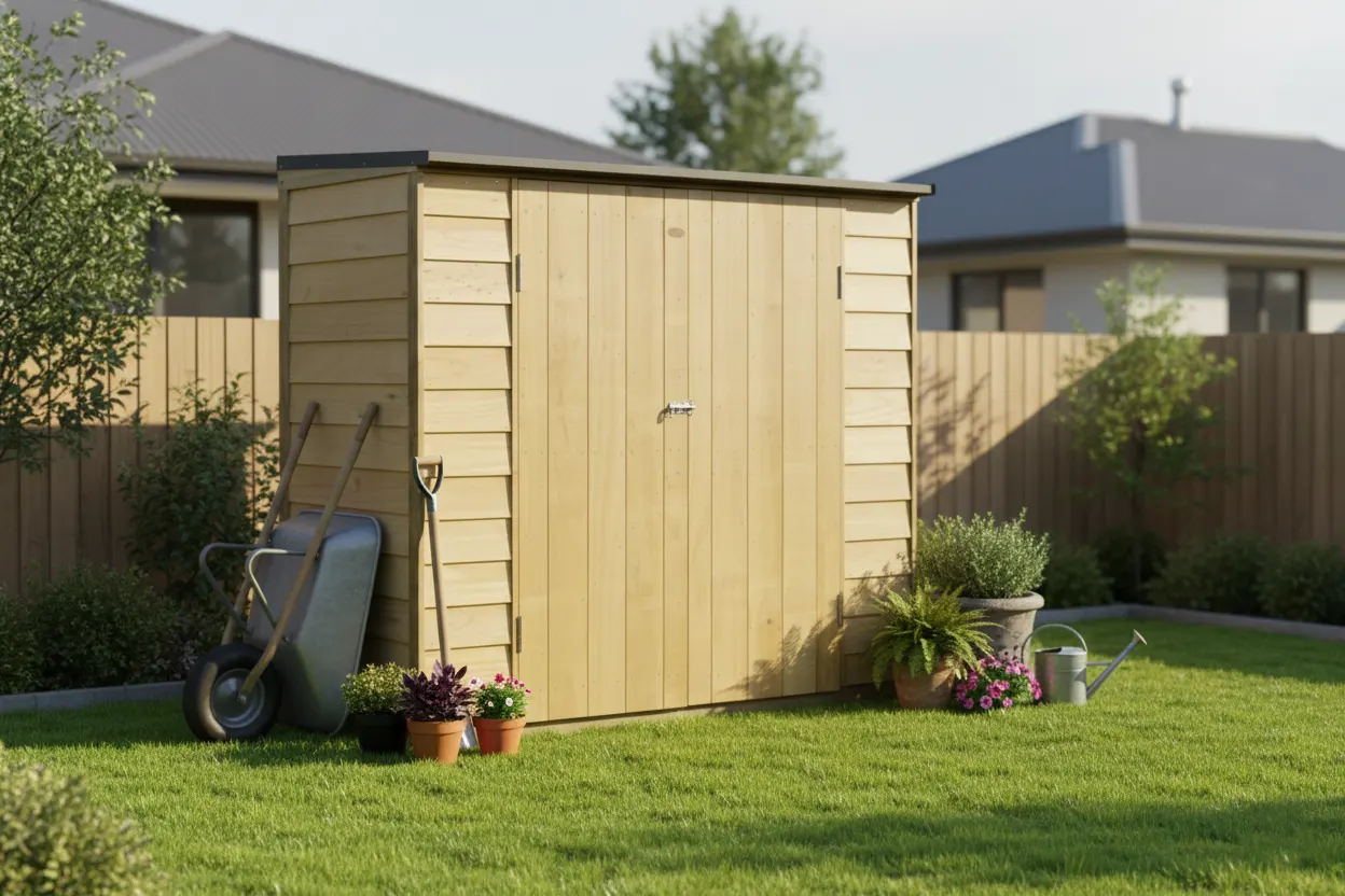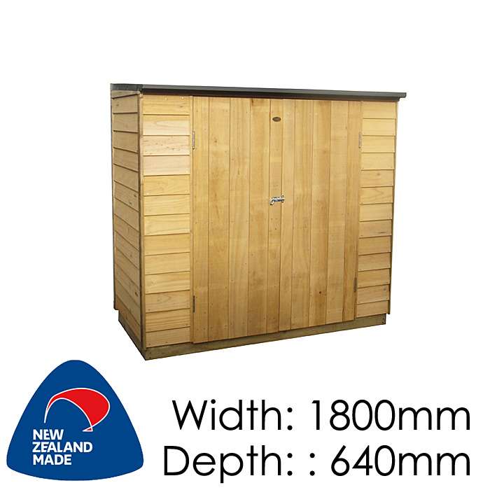 This ‘Mana’ Lean-to roof courtyard cupboard shed is very practical with double hinged doors on the front opening to 1200mm wide for easy access to the shelves on the back wall. For a deeper version see the Kapiti cupboard sheds. These small pine sheds are easy to assemble and come in pre made panel kitsets with a Karaka coloursteel roof. The Pinehaven courtyard cupboard range include floors and shelving in the kitset, making them the ideal solution for simple outdoor storage.