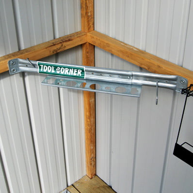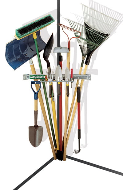 This extremely clever design turns an empty corner into an amazing storage area. It holds a variety of tools securely & yet allows for fuss free removal whenever they are needed. A special holder & hooks are also included for smaller items. Can also be used indoors to store mops & brooms upright to allow for proper air drying to prevent broom curling.