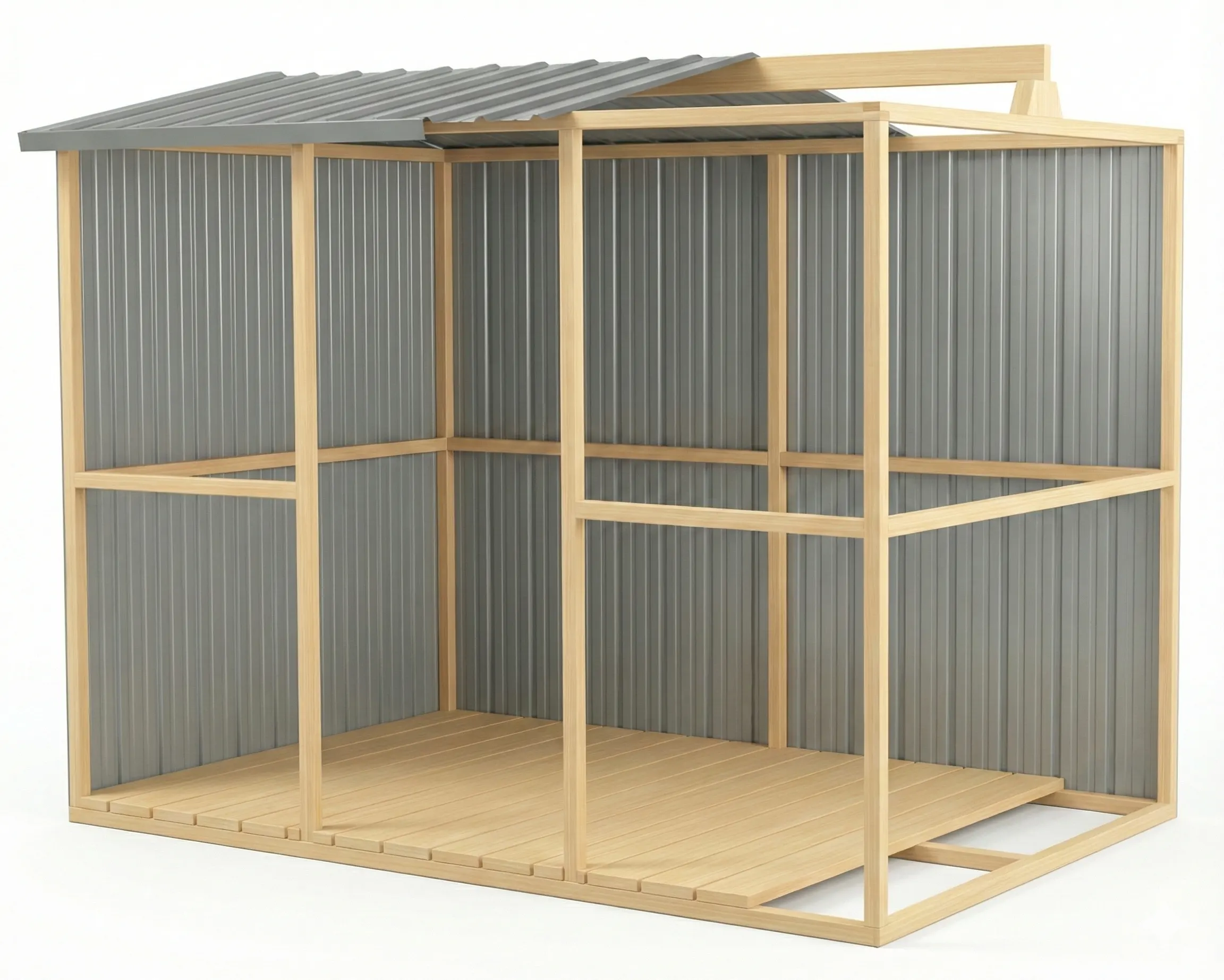 The Duratuf Kiwi MK4A Garden Shed is supplied as a comprehensive kit and is well‑suited to competent DIYers. Precut timber framing is provided to nail together, with sheets of steel for the walls and roof, along with flashings, door tracks, and a pre‑made door. The optional floor kit includes precut joists and floorboards; it may require a few small notches to be cut for the studs, and the floor can be nailed together with a hammer.