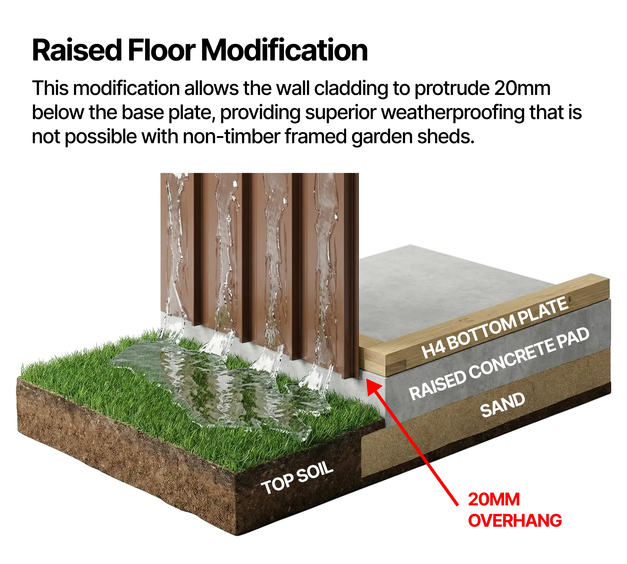 • Raised floor modification: Adapts the shed for use with a concrete floor, improving integration with an existing concrete pad.